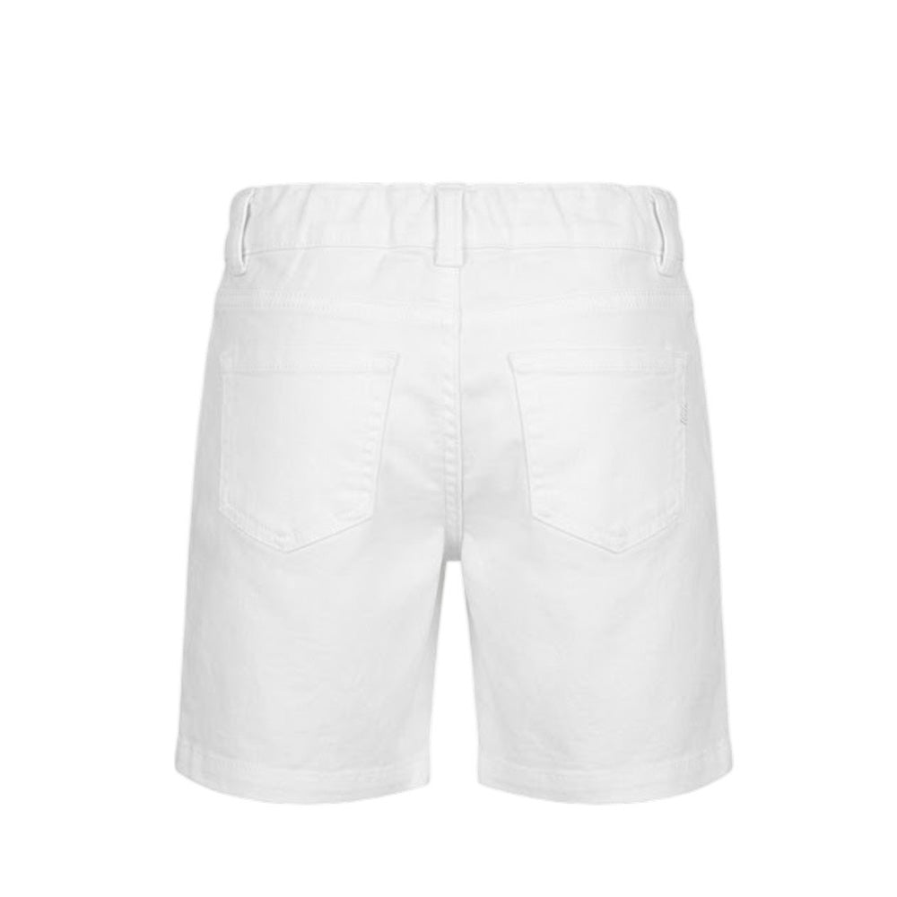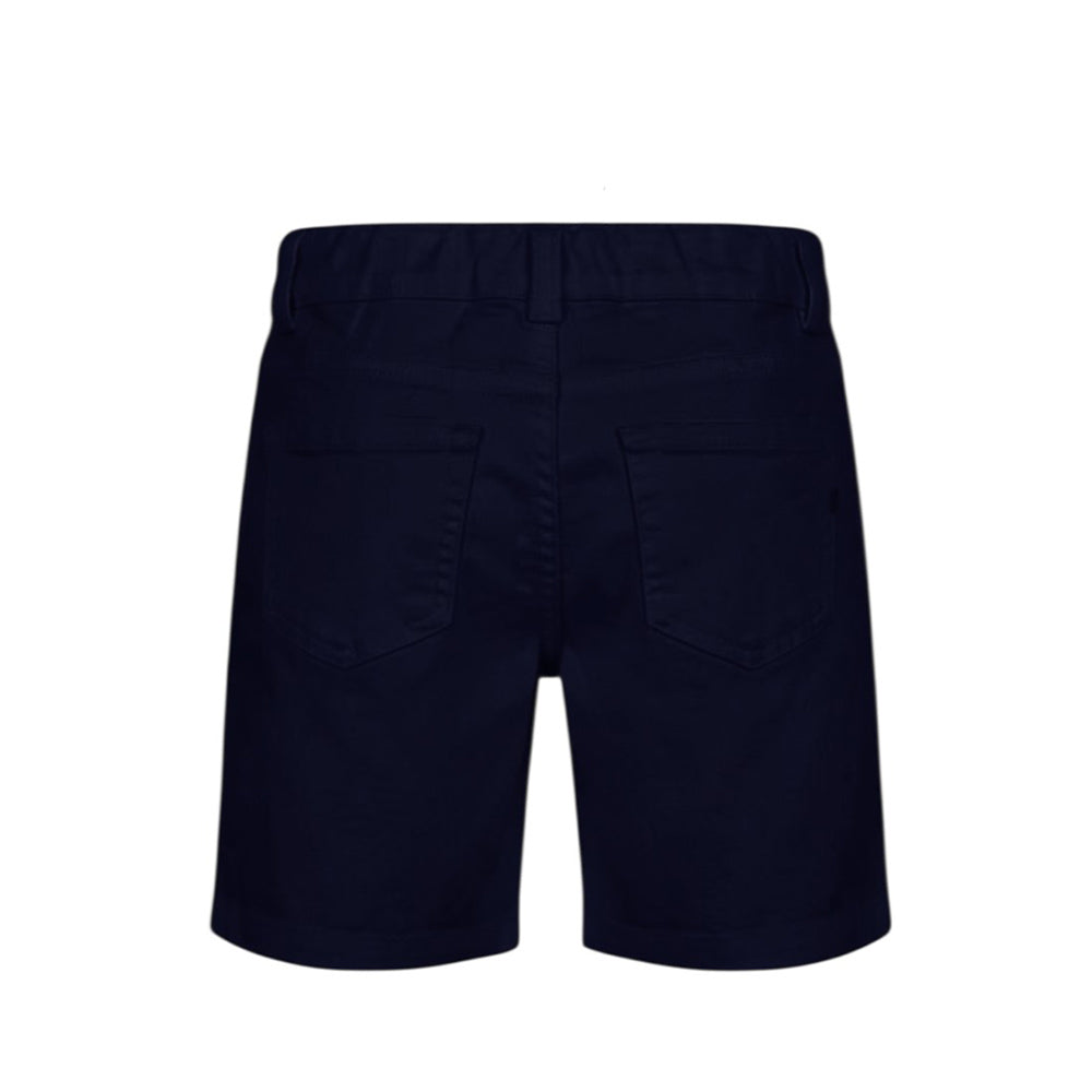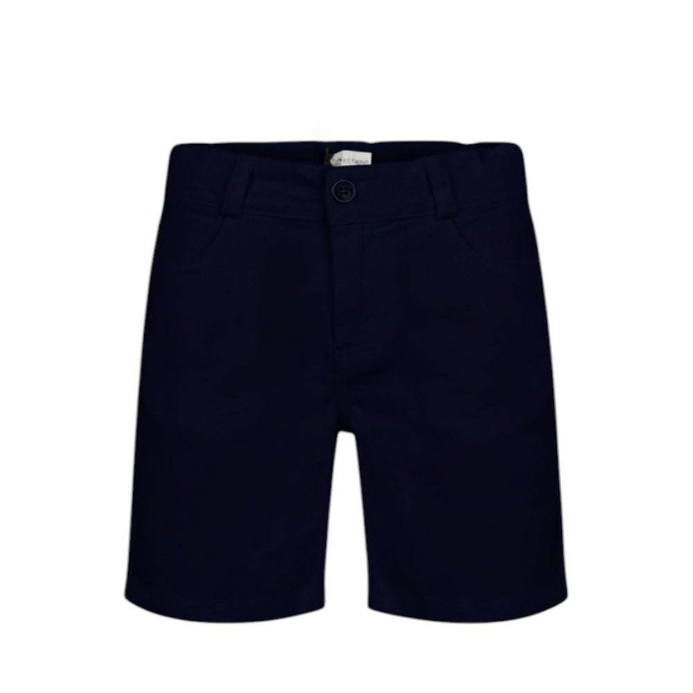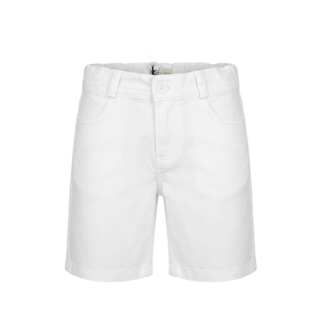 Bermuda realizzato in gabardina di cotone per bambino. Modello cinque tasche. Chiusura frontale con bottone, vita regolabile grazie ad elastico interno con bottoncini e passanti per cintura.