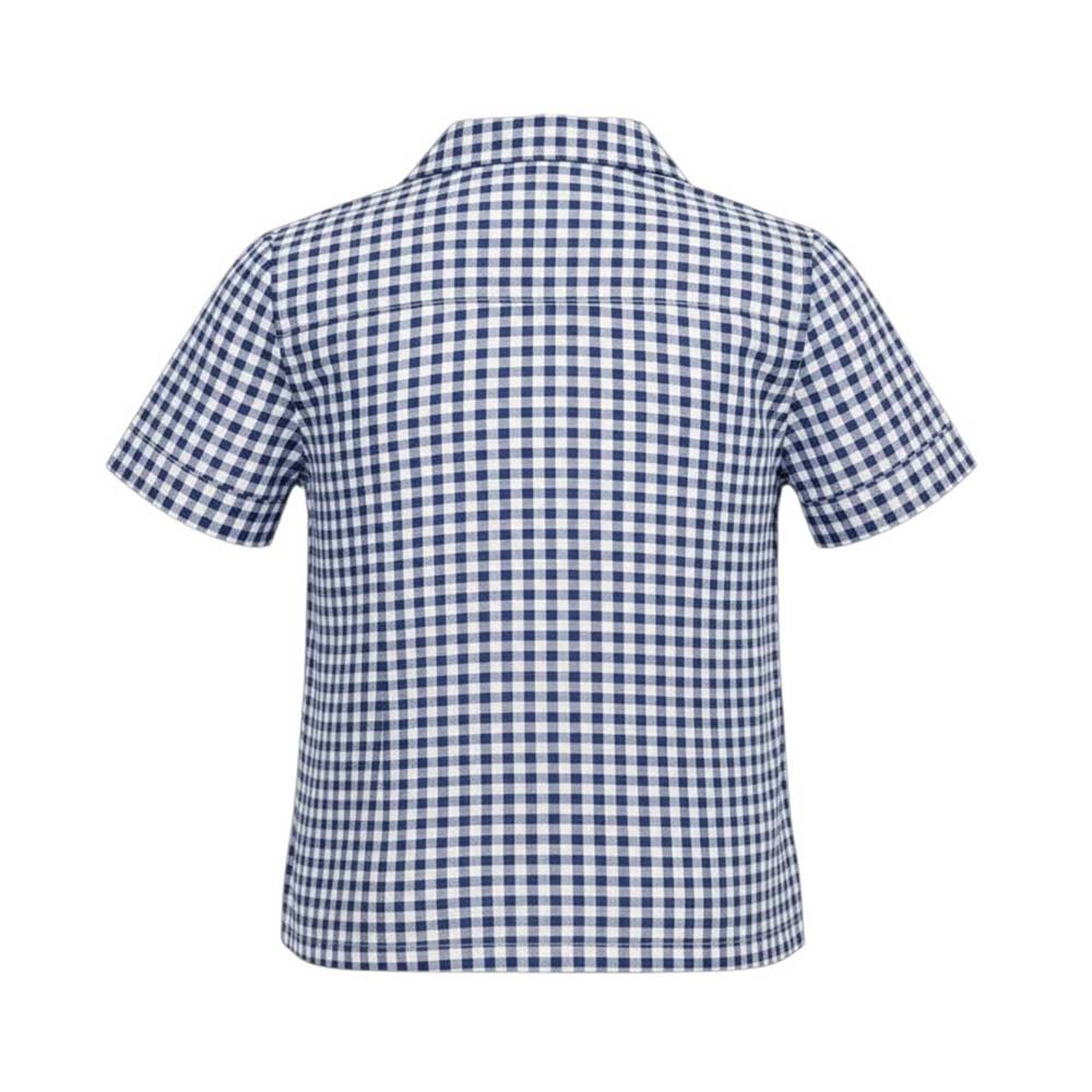 Camicia a quadretti realizzata in misto lino, caratterizzata da colletto classico, chiusura frontale con bottoni, maniche corte e orlo dritto.