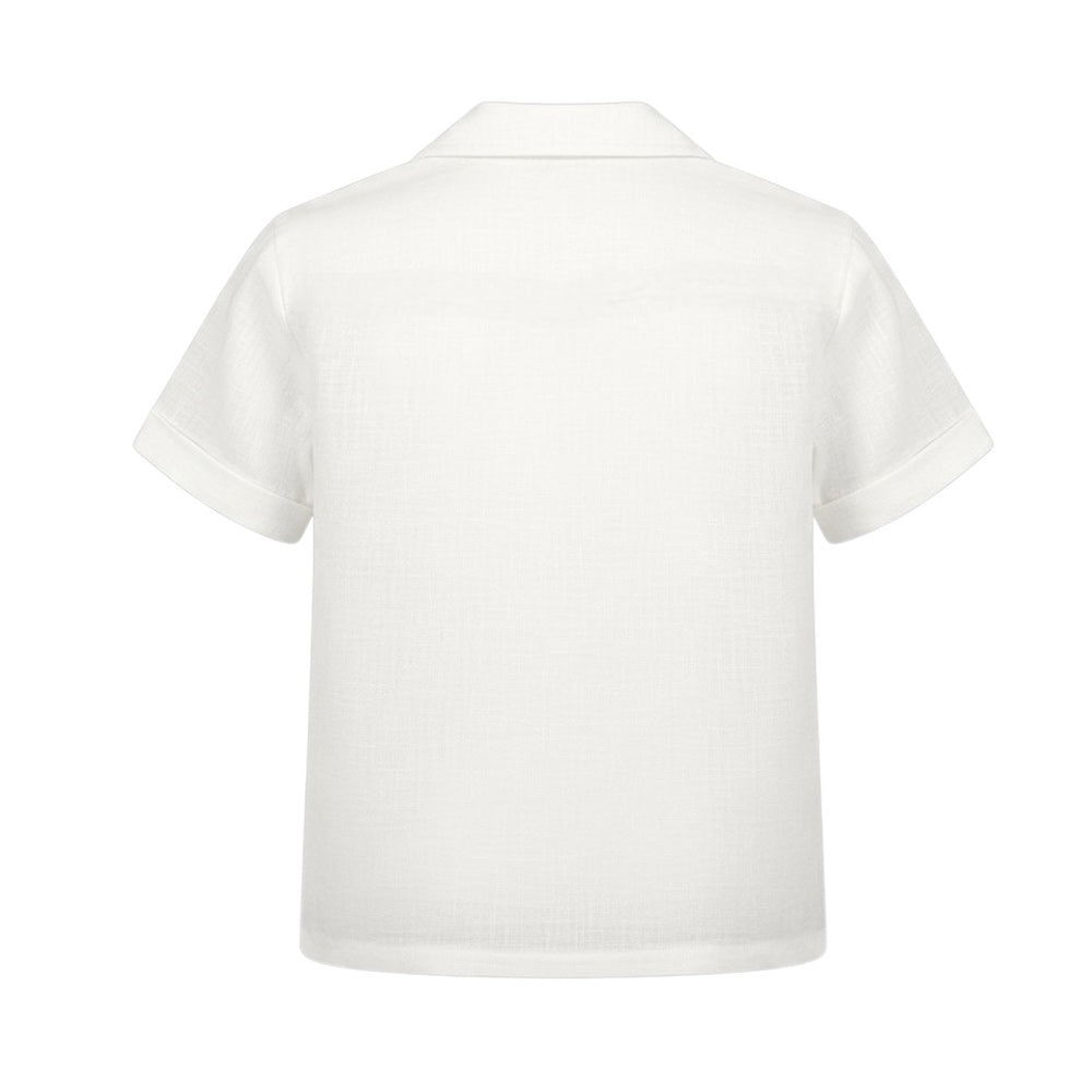 Camicia realizzata in lino, caratterizzata da colletto classico, chiusura frontale con bottoni, maniche corte e orlo dritto.