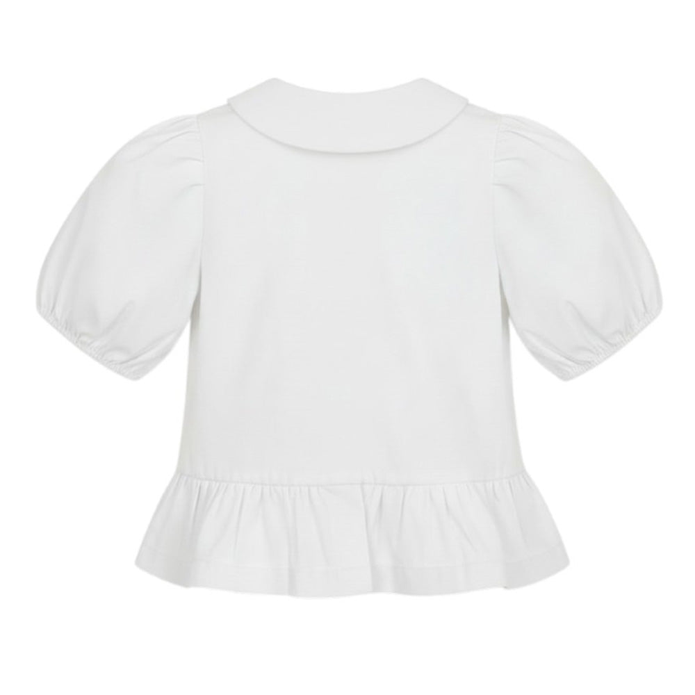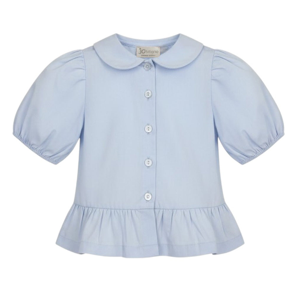 Camicia realizzata in popeline di cotone, caratterizzata da colletto classico, maniche corte a palloncino, chiusura frontale con bottoni e orlo a balze.