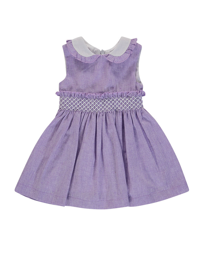 Vestina realizzata in lino senza maniche, colletto tondo con ruches, ricamo in punto smock nel punto vita, chiusura con zip sul retro.