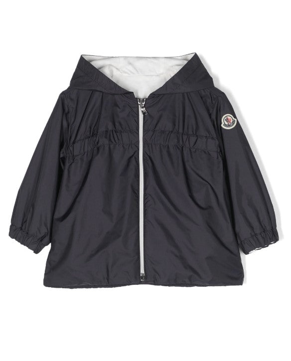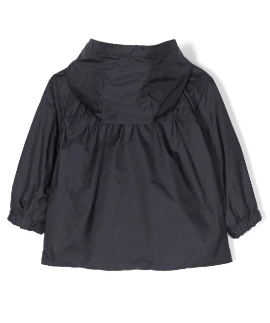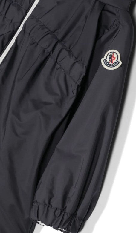 Nylon jacket with fixed hood, internal jersey lining, front zip fastening, side welt pockets, logo patch applied on the sleeve.