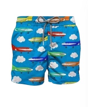 Boxer shorts, elasticated waist with drawstring, side welt pockets, back pocket, airplane pattern, logo applied on the back.