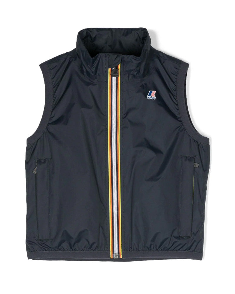 Giubbino smanicato in nylo, chiusura frontale con zip, tasche a filetto con zip, logo stampato.