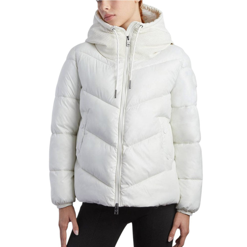 3-feather jacket, fixed velvet hood, America pockets with clips, zip fastening, applied logo.