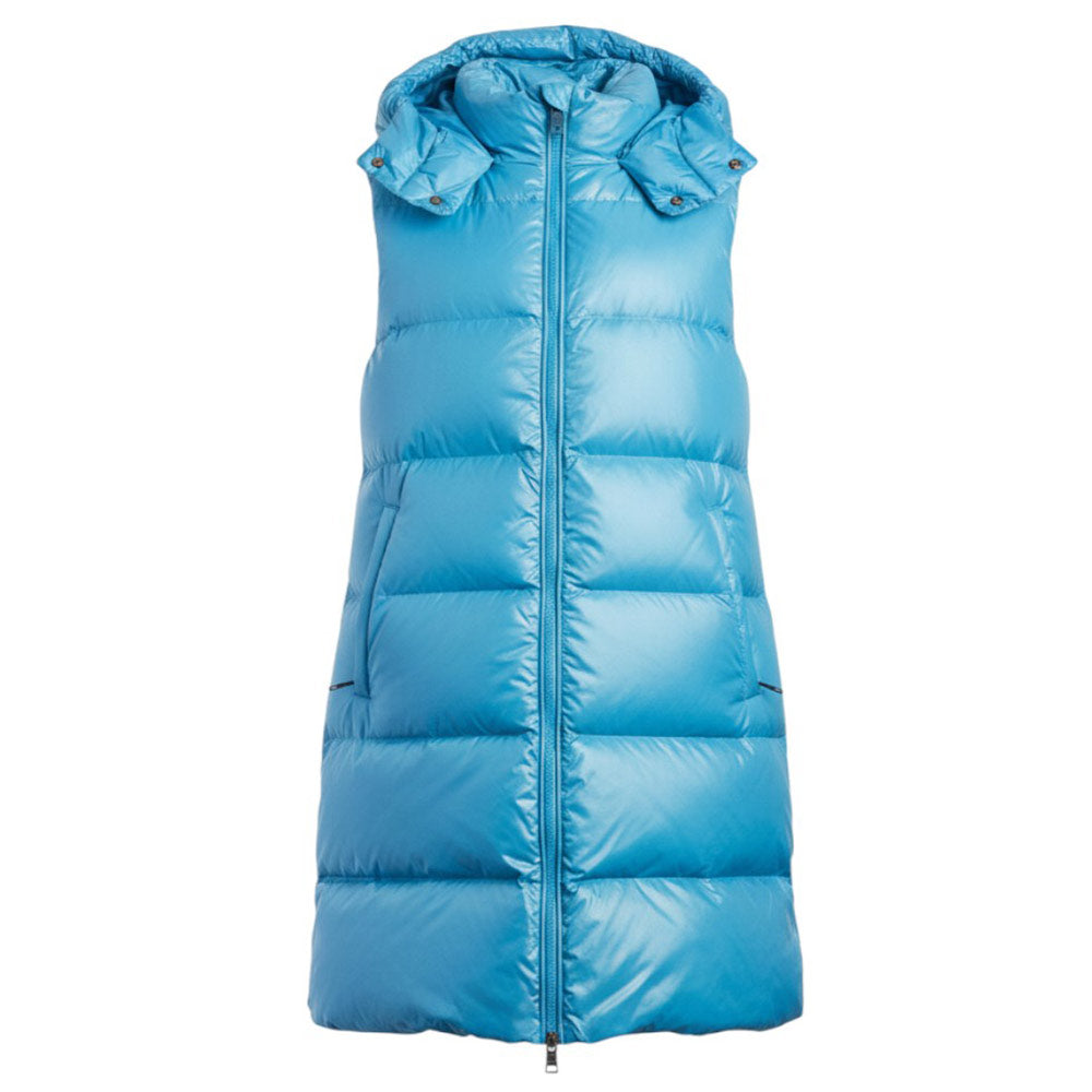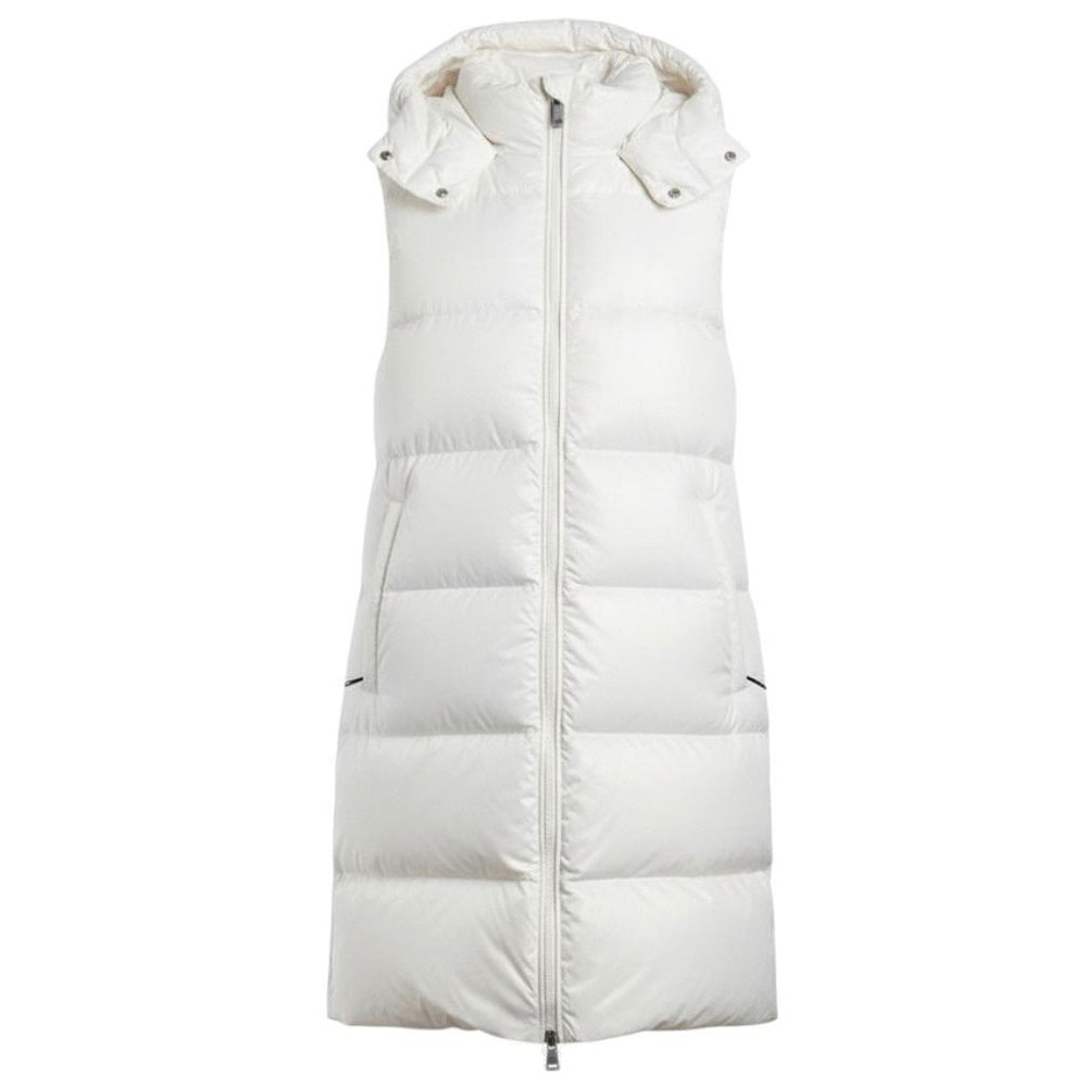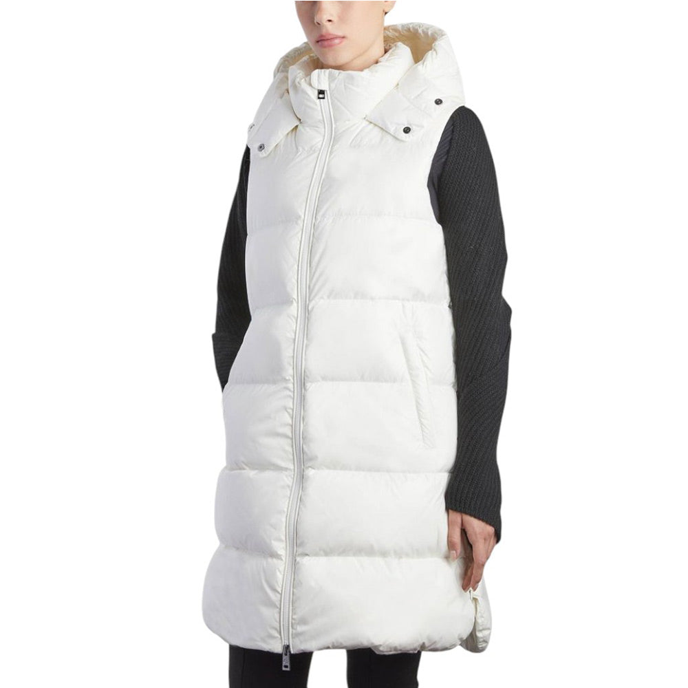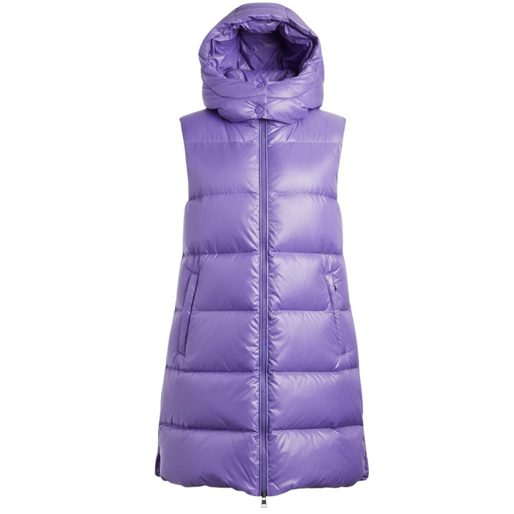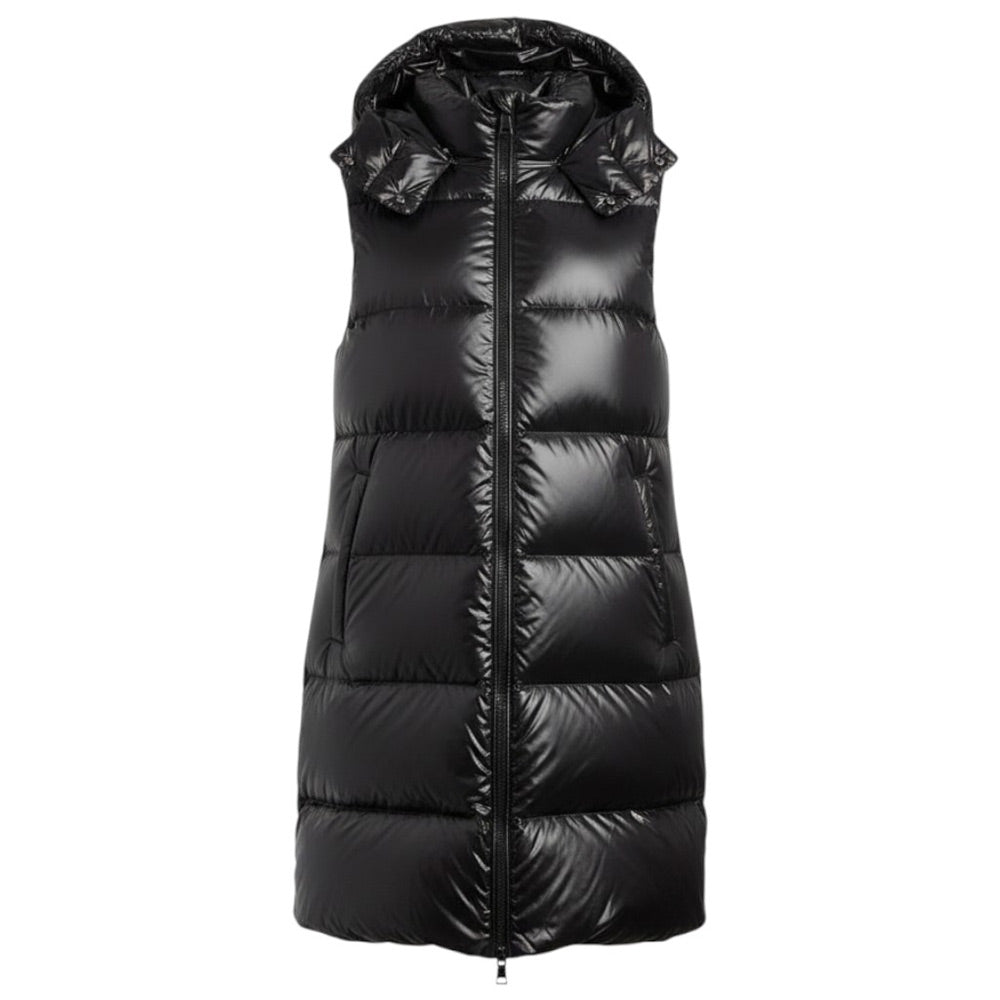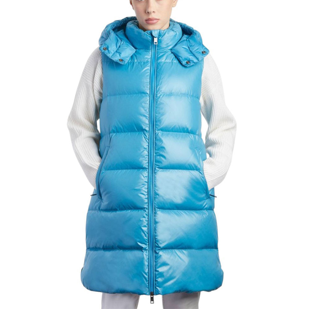 Long sleeveless jacket, removable hood, zip pockets, side slits with invisible zip, zip fastening.