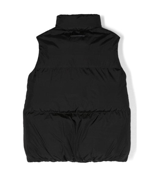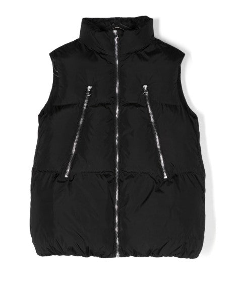 Long sleeveless jacket, quilted fabric, zip fastening.