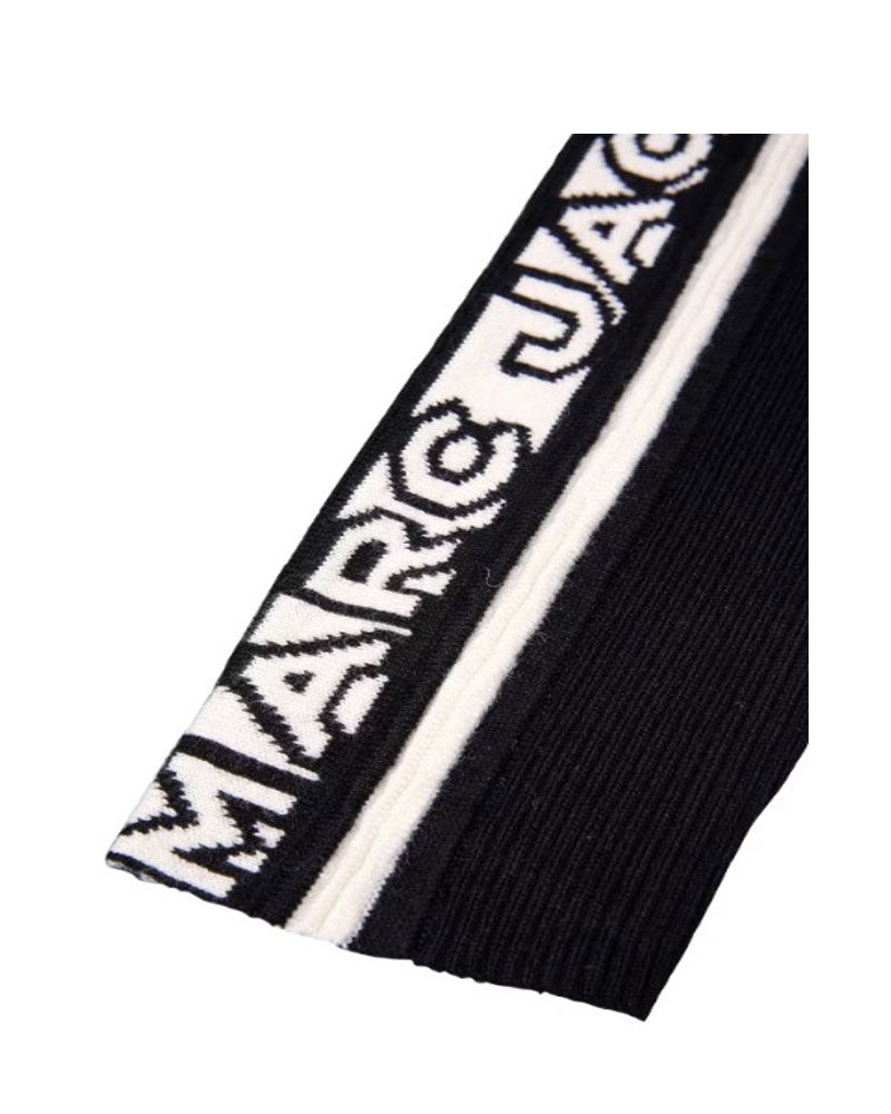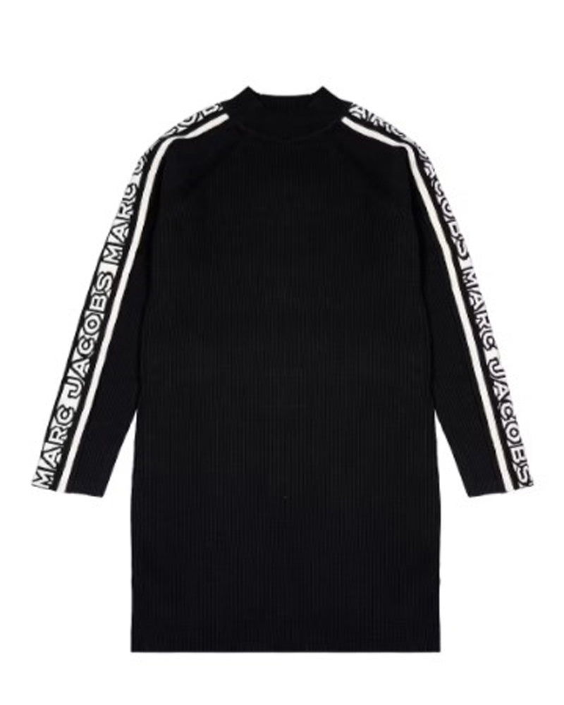 Abito realizzato in maglia a coste da bambina. Presenta mezzo collo, maniche lunghe con logo jacquard ad intarsio, orlo dritto.
