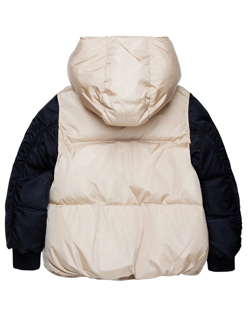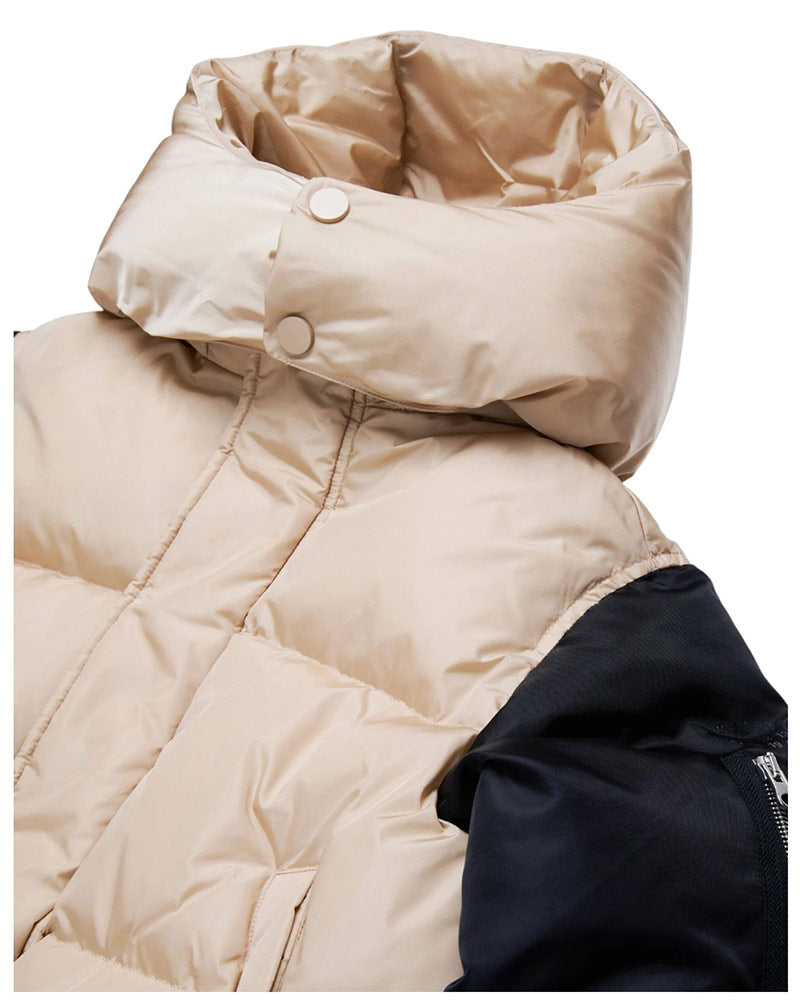 Giubbino imbottito realizzato in nylon semilucido. Presenta design trapuntato, cappuccio rimovibile, collo alto, maniche lunghe a contrasto con polsi a costine, chiusura frontale con zip e clips, due tasche frontali, fondo elasticizzato. È decorato con taschino applicato e logo stampato sulla manica .