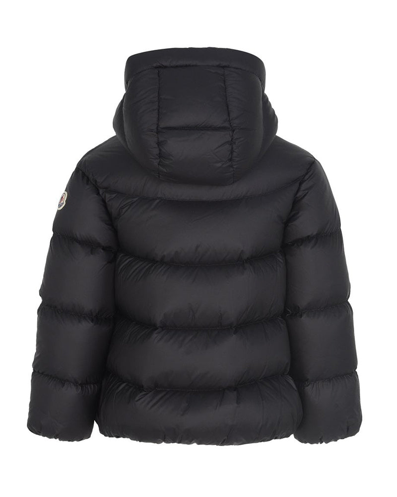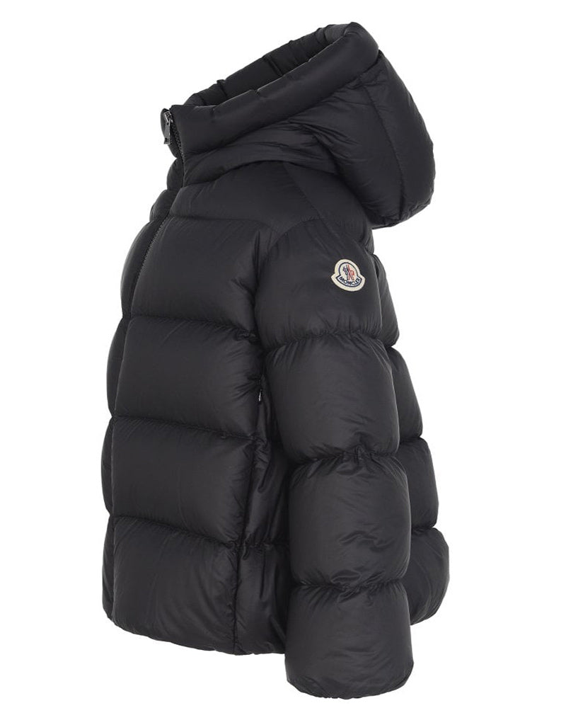 Quilted jacket with hood, flared model, front zip fastening, side welt pockets with zip, logo patch application on the sleeve.