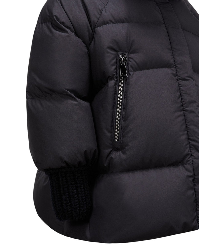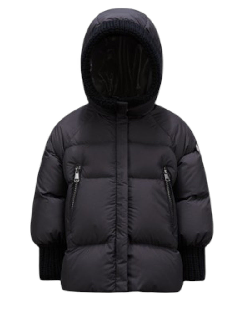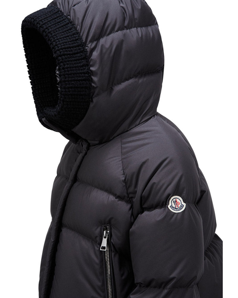 Moncler Ronda padded jacket made of polyester. It features a quilted design, fixed hood, front zip closure, logo patch on the sleeve, side zip pockets, ribbed hem.