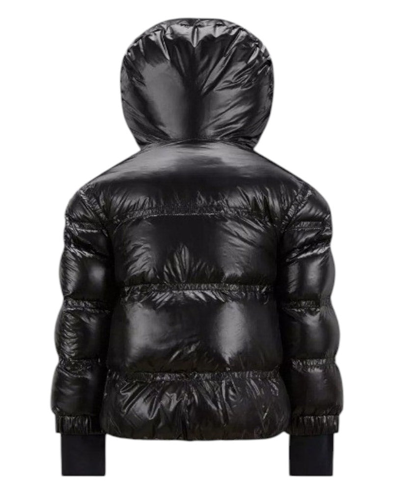Quilted jacket with teddy-lined hood, front zip fastening, side pockets with clips, logo patch application on the sleeve.