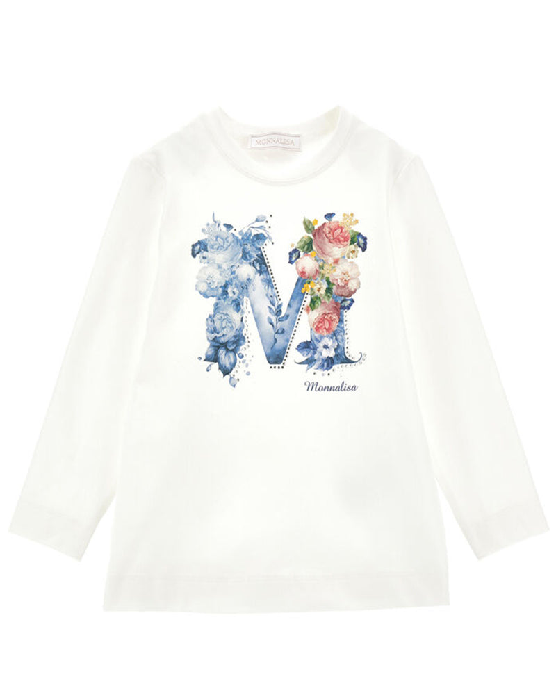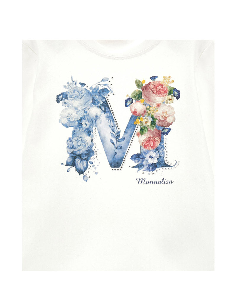 T-shirt girocollo realizzata in jersey di cotone a maniche lunghe. È decorata con stampa M floreale e dettagli di strass sul davanti.