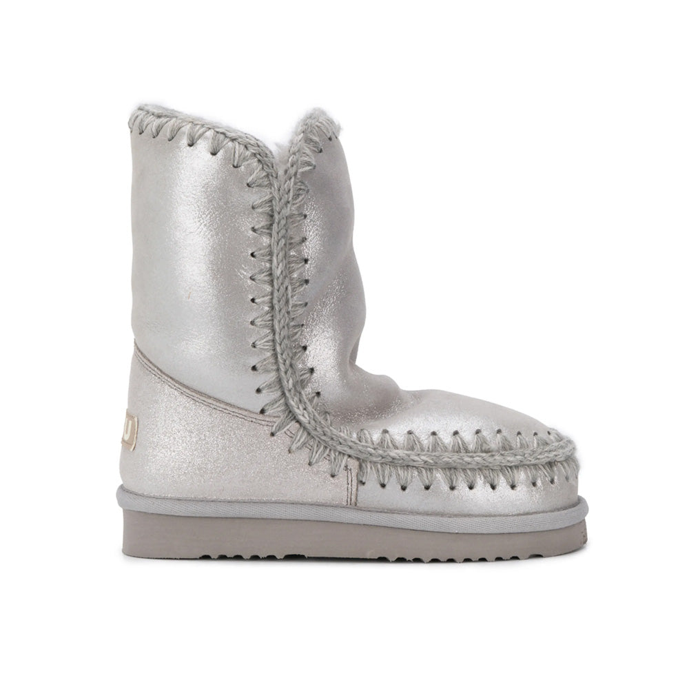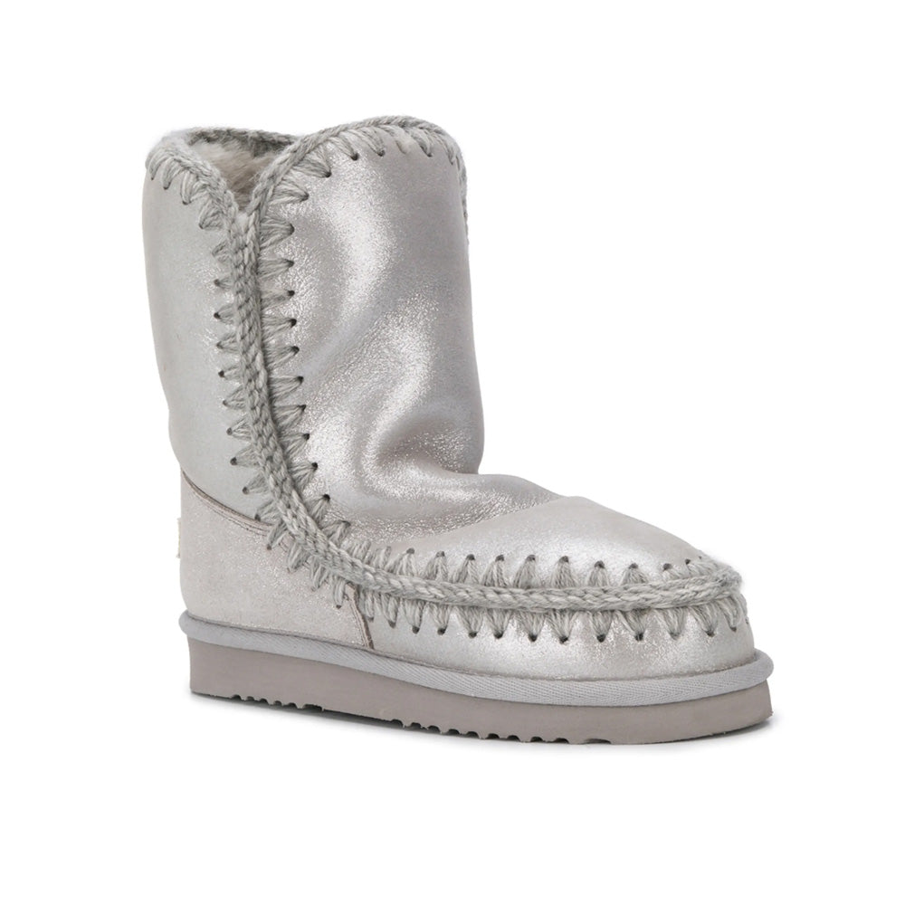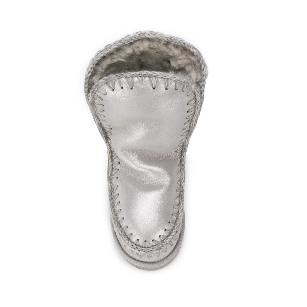 Eskimo Boot in pelle glitterato Mou. Modello in splendido e caldo montone double-face, con cuciture in lana lavorate all'uncinetto, tallone rinforzato e una resistente suola esterna in EVA e gomma.