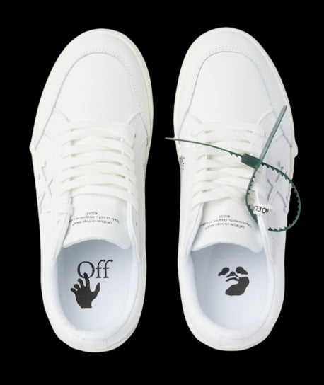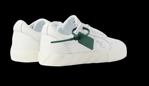 Off-white vulcanized sneakers in white leather, laces, round toe, applied logo label, tongue, white logo patch, applied side, green iconic tag, applied