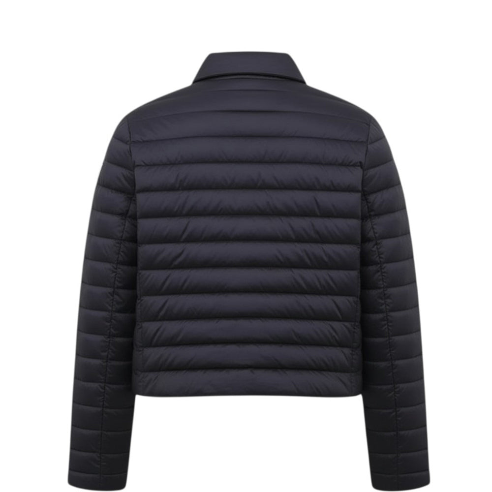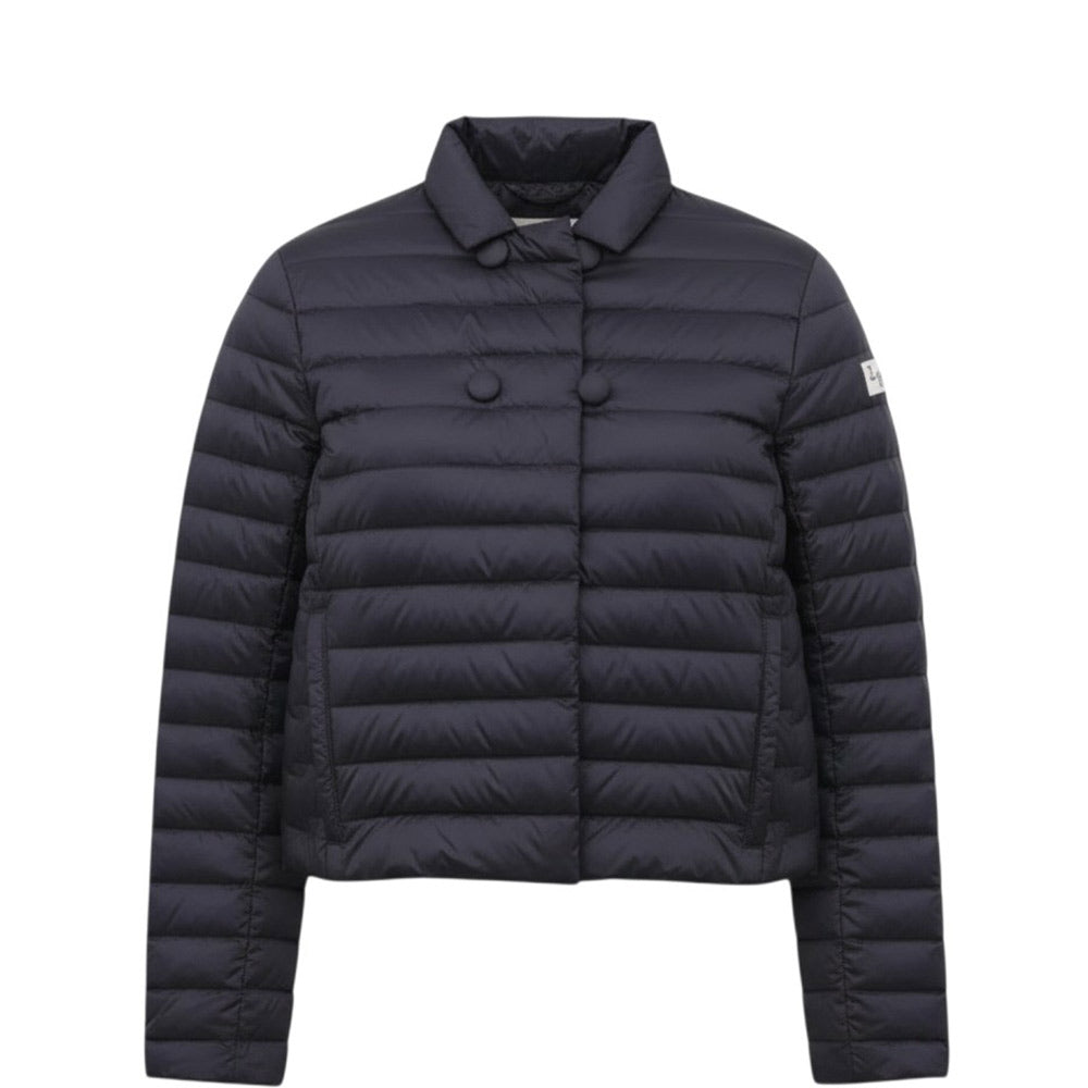 Quilted jacket, front button fastening, America pocket, logo applied on the sleeve.
