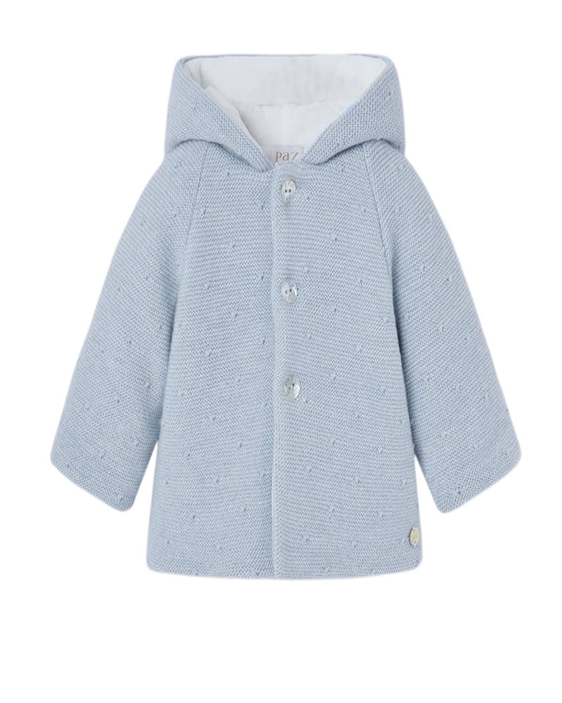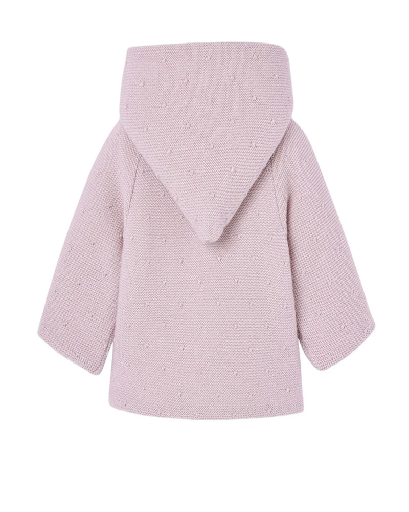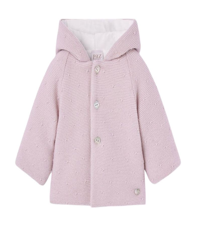 Cappottino con cappuccio Paz Rodríguez in lana merino rosa chiaro, con lavorazione a maglia e piccoli pois ricamati. Interno foderato in tessuto morbido per maggiore comfort e calore. Elegante e ideale per le giornate fredde.