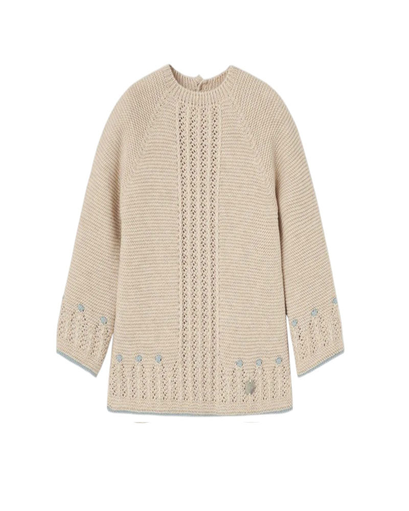 Maglia in miscela di cotone e cashmere con punto liscio e trafori sullo sprone. Colletto in tessuto a contrasto e chiusura posteriore con bottoni. Completa il design un piccolo fiocco decorativo e finiture curate su fondo e polsini.