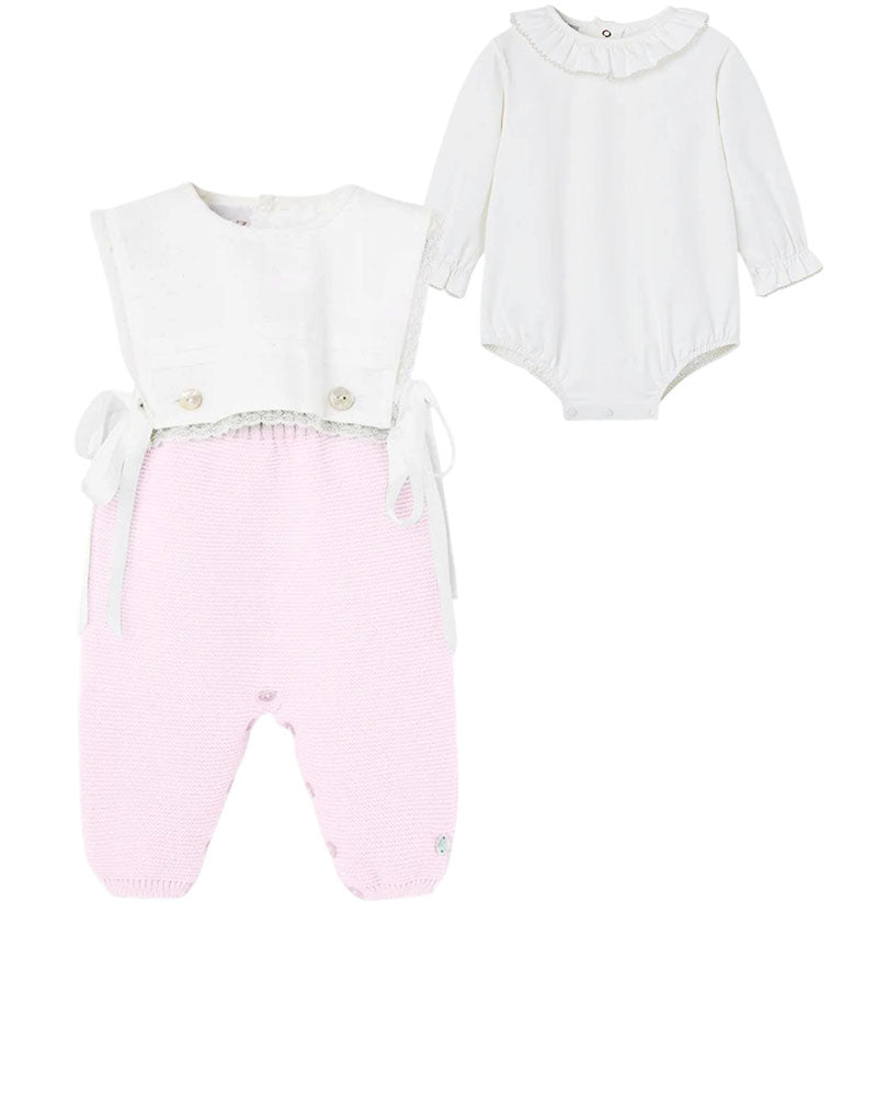 Tutina 2 pezzi per neonato/a firmata Paz Rodríguez, in maglia rosa con corpetto bianco decorato con pizzi, pieghe e bottoncini completa di Body a maniche lunghe in jersey con classico colletto baby e bottoni sul davanti. Dotata di bottoni sul cavallo per facilitare il cambio. Elegante e delicata, ideale per occasioni speciali.