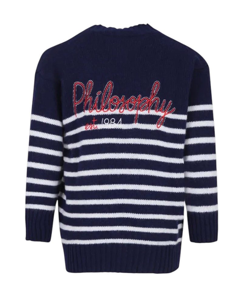 Cardigan blu realizzato in misto lana e cashmere da bambina. Presenta scollo a V, maniche lunghe, chiusura con bottoni sul davanti e finiture a coste. È decorato con motivo a righe ad intarsio e logo ricamato sul retro.