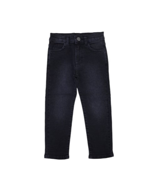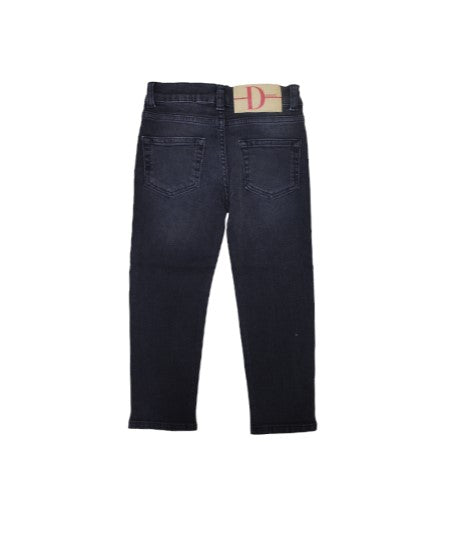 Cotton denim jeans, five-pocket model. Front closure with button and zip.