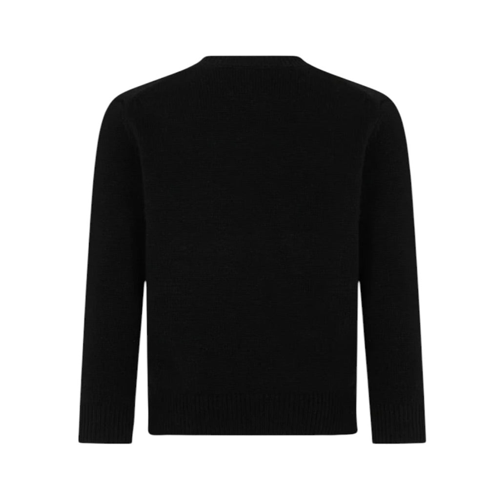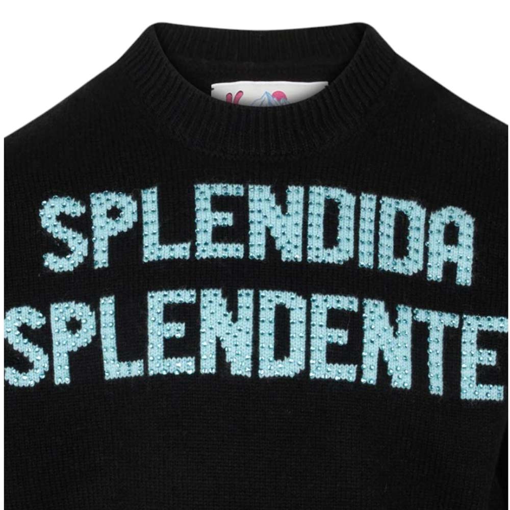 Crew neck wool sweater, ribbed cuffs and hem, rhinestone applications on the front.