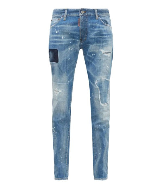 Cool Guy jeans made of stretch cotton denim with used-effect details and bleached stains. Five-pocket model, button fly and logo jacron on the back of the waist. Slim fit with low waist.
