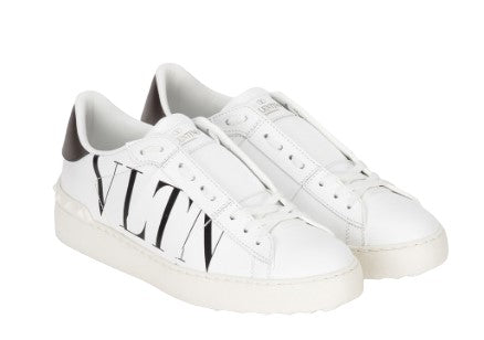 Valentino Garavani white sneakers with black writing. Tongue with embossed logo, round toe, front closure with laces and flat rubber sole.
