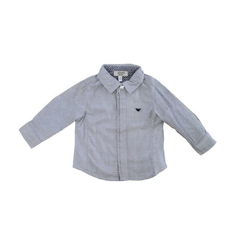 Long sleeve baby shirt with classic collar. Embroidered symbol on the chest. Front button closure.