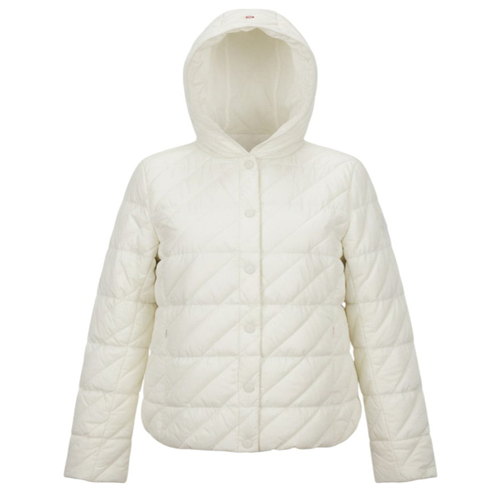 Jacket in lightweight, recycled microfibre, water-repellent treatment, internally padded with Plume no Plume®, central opening with automatic snaps, practical side pockets with invisible zip fastening, fixed hood, side slits.
