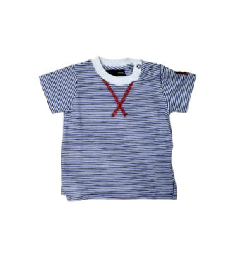 Crew neck T-shirt with short sleeves, striped pattern. Closure clips on the shoulder.